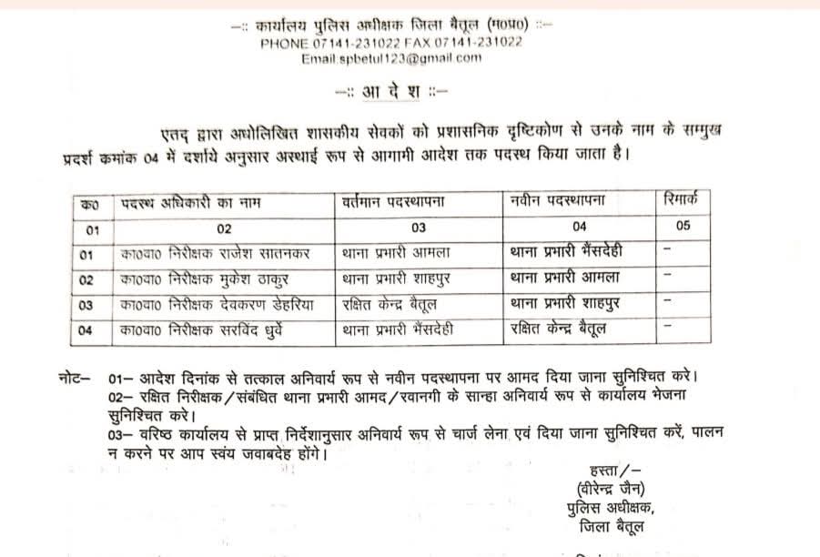 विधायक की सख़्ती के बाद बैतूल एसपी ने भैंसदेही,शाहपुर,आमला के टीआई के किये तबादले, राजेश सातनकर को भैंसदेही थाने की कामना।